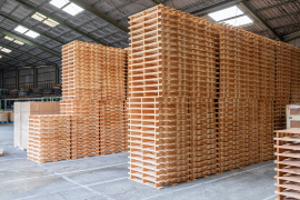 国内や海外から仕入れた木材を使ってパレットを作り、お客様に販売しています。パレットは、貨物を移動したり保管したりする際の土台として使用されるものです。保有している自動パレット打ち機により、外部の協力工場の稼働を含めて月間で約10,000点の生産を行うことができます。